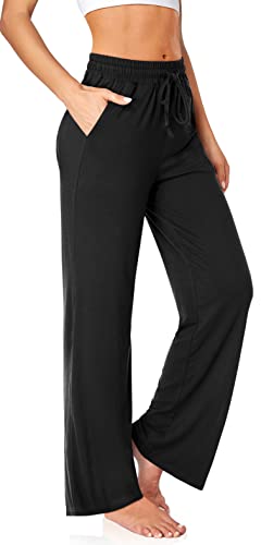UEU Women's Casual Loose Wide Leg Yoga Pants Lounge Pajamas High Waisted Drawstring Cozy Joggers Athletic Sweatpants with Pockets Black