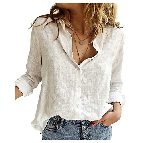 Kvinnors Solida Färg Casual Loose Long Sleeve Linen Shirt -knappen Down Shirts for Women