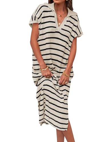 ZESICA Women's Summer Striped Midi Dress 2025 Casual Short Sleeve V Neck Loose Knitted Side Slit Long Sweater Dresses,Ivory,Small