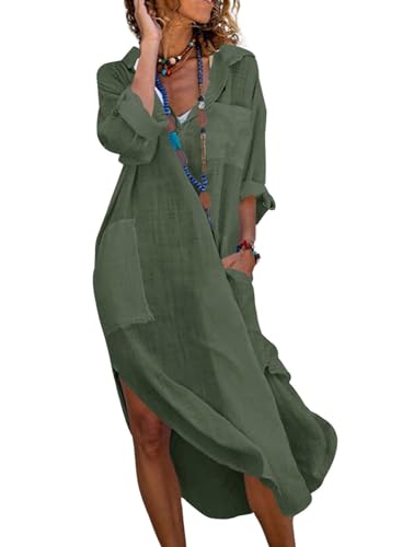 utcoco Womens Casual Loose Cotton Linen Long Shirt Dress Lapel Button Cuffed Sleeve Side Split Dresses with Pockets (Small, Army Green)