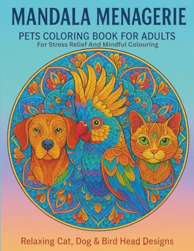 Mandala Menagerie: Pets Coloring Book for Adults: Relaxing Cat, Dog & Bird Head Designs for Stress Relief and Mindful Coloring
