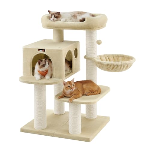 Feandrea Large Cat Tree, 75" Tall Cat Tower, Multi-Level, med 2 kennlar, 2 korgar, 5 skrapstolpar, självvårdande, abborre, hängmatta, sandbeige PCT183Y01