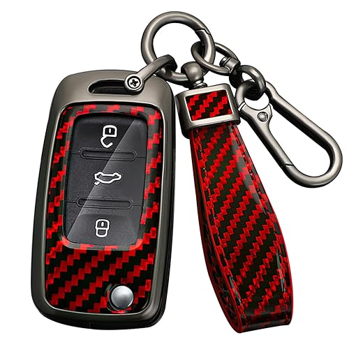 HIBEYO Fällnyckel bilnyckel fodral passar Volkswagen kolfiber skyddande fodral nyckelfodral för VW Golf CC Caddy Beetle Transporter för Skoda Superb Seat nyckel väska 3 knappar röd