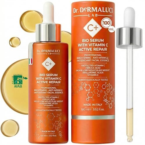 Ansiktsserum Vitamin C 100ML BIO | Anti-rynk, Anti-fläckar, Ljusgivande, Återfuktande | Hyaluronsyra & Ferulinsyra | Med Gurkmeja & Centella Asiatica | Dermatologiskt Testad, Made in Italy