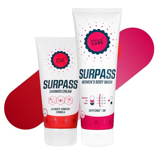 SURPASS - Cykelset för Kvinnor - Chamois Cream & Shower Gel för Idrottare - Mer Prestanda och Komfort På Långa Turer - Anti-Skavande Effekt & Regenererande Hudrengöring - 170ml + 250ml