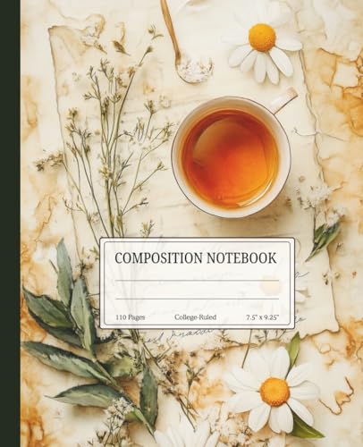 Tea & Daisies Composition Notebook | College Ruled | 7.5 x 9.25" | 110 Lined Pages | Gift for Students: Vintage Aesthetic Notebook with Chamomile Flowers and Tea Cup – Matte Cover