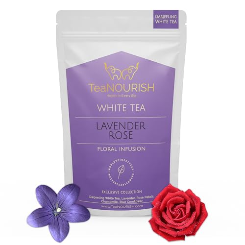TeaNOURISH Lavender Rose White Tea | Darjeeling Silver Needles White Loose Leaf Tea Blended with Lavender, Rose Petals, Chamomile & Blue Cornflower - 50g