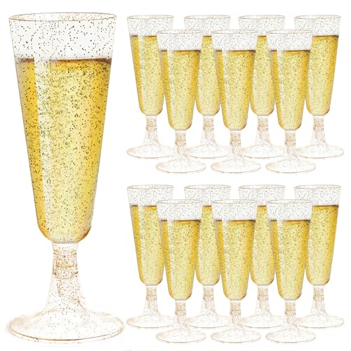 Atliberswo 20 Stycken Champagneglas Plast Guldset Med Guldglitter, 150 ml Återanvändbara, Cocktailglas för Fester, Bröllop, Födelsedagar
