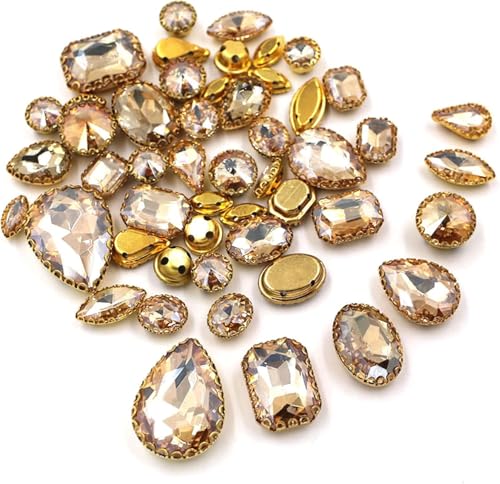 strass, 50Pcs/Bag Mix Shape Crystal Stones Sewing Gold Lace Claw Setting Glass Rhinestone DIY Shoes Clothing Accessories(Champagne)