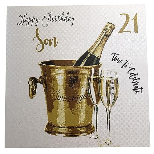 vita bomullskort champagne hink glitterad, son 21 glad handgjord 21-födelsedagskort, vit, WBS21-SON
