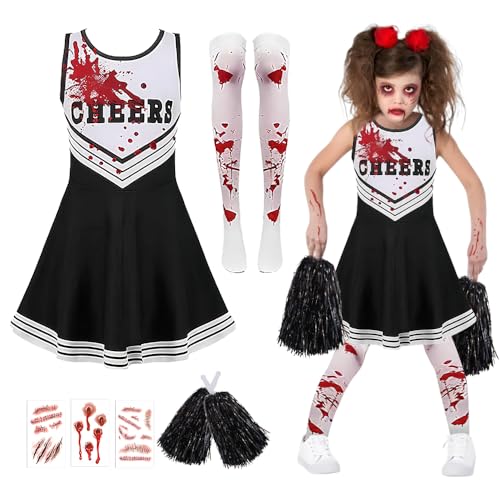 XPJBKC Cheerleader-kostym för barn, cheerleader-dräkt till halloween, för längd 130 cm, zombie-cheerleader-kostym med strumpor, pompoms, klistermärken med konstblod, karnevalsdräkt för flickor