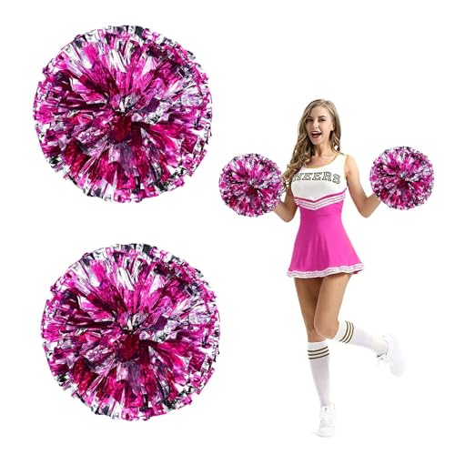 Fonyiunce 2 stycken Pom Poms Cheerleader, Pom Pom Pom Cheerleader med handtag, metallisk cheerleading pompons blomboll för idrottsmöte, stadion, fest, semester (röd rosa, silver)