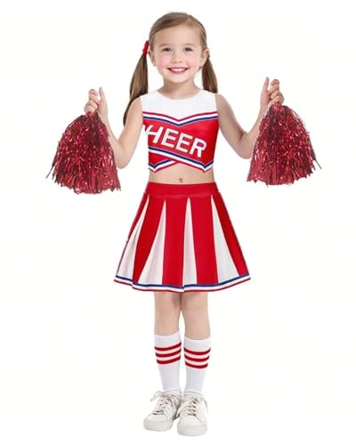 JiAmy Cheerleader-kostym, skolspel Cheerleading-uniform med pompoms och strumpor, halloween, fin utklädnad outfit för barn 7-8 år röd