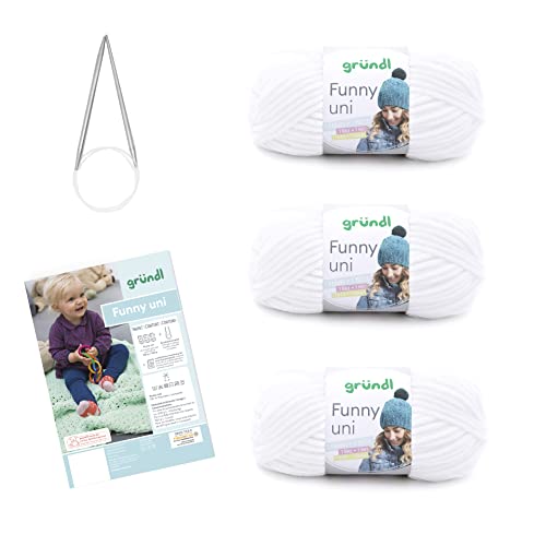Gründl stickset Funny uni (sammetsliknande chenille-garn) 3 x 100 g + nålar 5 – 6 + instruktioner för en babyfilt, 34 x 19 x 8 cm, vit