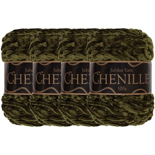 JubileeYarn Chenille Yarn – kamgarn, vikt – 100g/nystan – olivolja – mörk armégrön sammet – virkning och stickgarn – 4 nystan