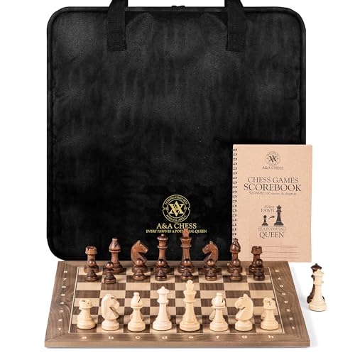 A&A Professional Wooden Chess and Checkers Set, 15.5" Wooden Board with 3" Weighted Wooden Chess Pieces, Chess Scorebook and Storage Bag