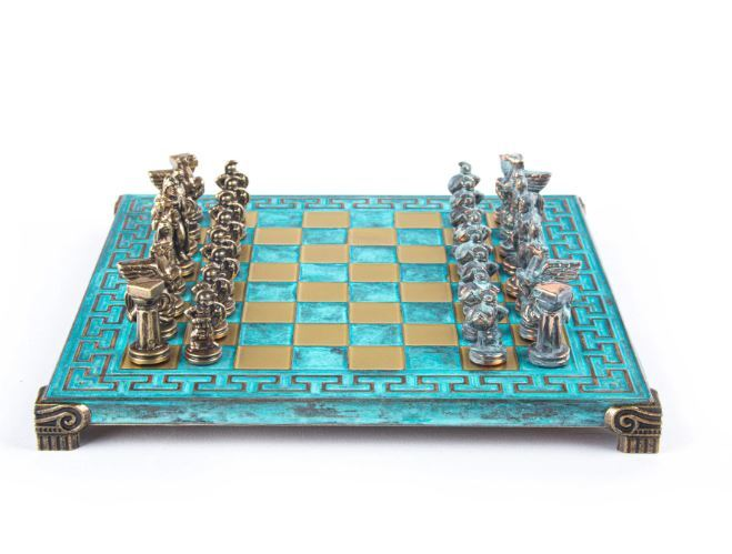 Spartan Warrior Chess set with blue/brown chessmen and Meander bronze chessboard 28 x 28cm (Small) Manopoulos