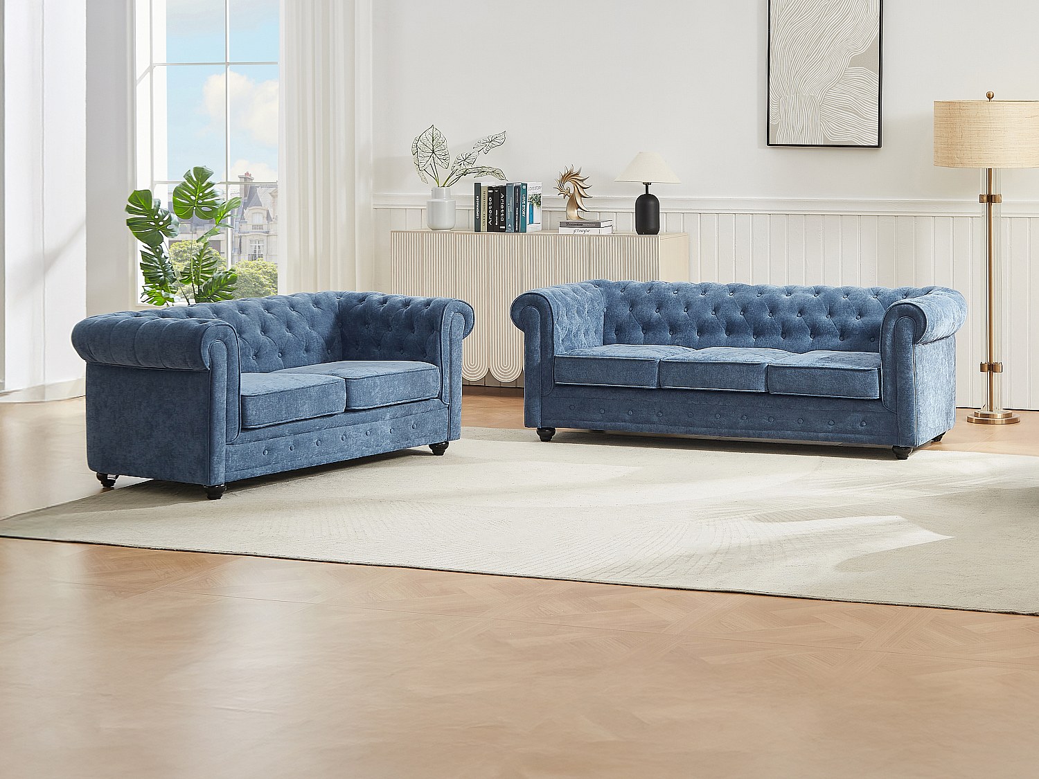3-sits och 2-sits soffor i blått CHESTERFIELD-tyg