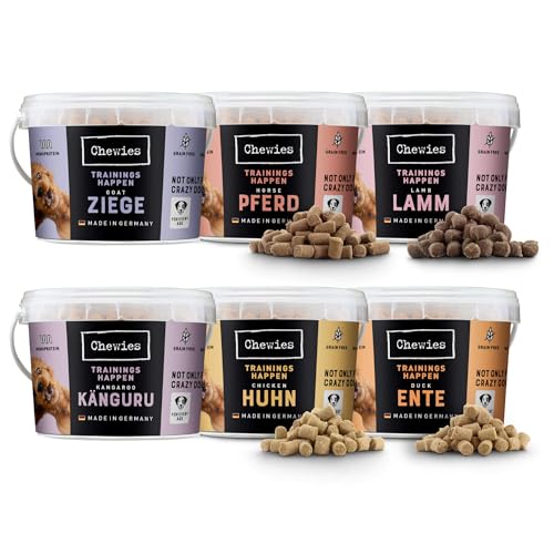 Chewies Träningshapen hundgodis mix provpaket spannmålsfritt, mjukt och utan socker – monoprotein hundgodis i en återförslutningsbar hink – Made in Germany (6 x 300 g)