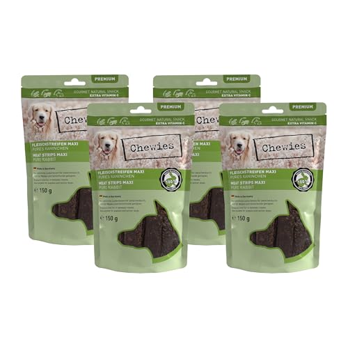Chewies Köttremsor Maxi hundgodis tillverkat av 100% kaninkött – 4 x 150 g – lufttorkade kaniner tuggremsor för hundar – sockerfri och spannmålsfri – torkkött från kanin