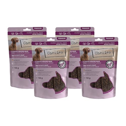 Chewies Köttremsor Maxi hundgodis tillverkade av 100% känguruficka – 4 x 150 g – lufttorkade känguru tuggremsor för hundar – sockerfritt och spannmålsfri – torkkött från känguru