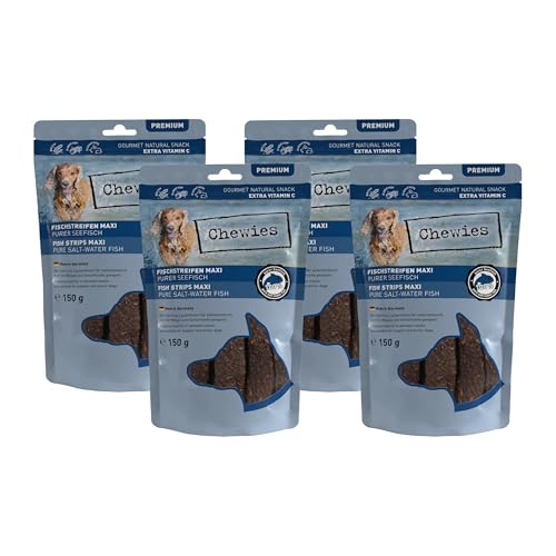 Chewies Köttremsor Maxi hundgodis gjorda av 100% havsfisk – 4 x 150 g – lufttorkade fiskar tuggremsor för hundar – naturligt och spannmålsfri – Torrfisk