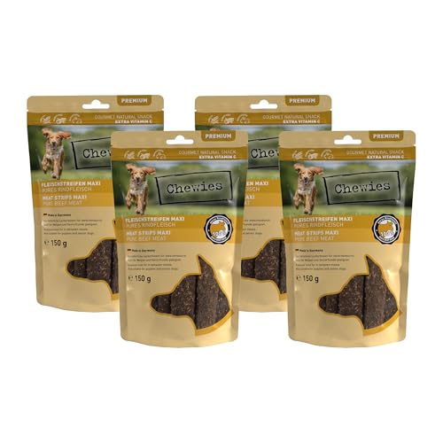 Chewies Köttremsor Maxi hundgodis gjorda av 100% nötkött – 4 x 150 g – lufttorkade nötkreatur tuggremsor för hundar – sockerfri och spannmålsfri – torkkött från nötkött