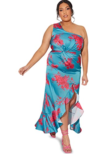 Chi Chi London Dam plus size en axel blommig tryckt midiklänning i grönblå, 20, Blågrön, 46 SE/Plus