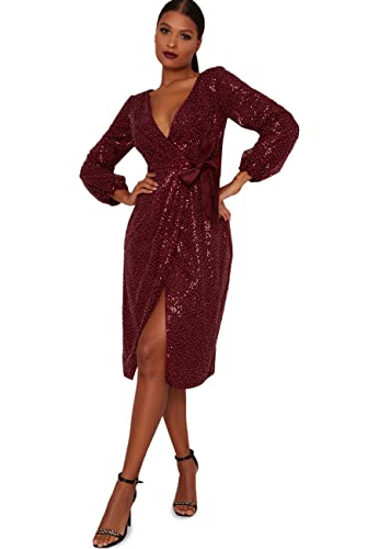 Chi Chi London Dam paljett midi-festklänning med omlottdesign i röd cocktail, vinröd, 10, Vinröd, 36 SE