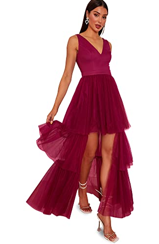 Chi Chi London Damklänning med v-ringning, tylldoppfåll, i Berry, 16, Bär, 42 SE