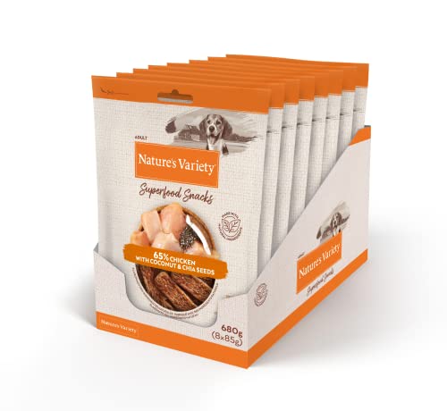 Nature's Variety Superfoods - Snacks för vuxna hundar med kyckling, med kokos och chiafrön. 85 g x 8