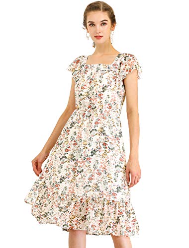 Allegra K Dam blommig chiffong fladdrande ärm bälte fyrkantig hals veckad fåll klänning, Vitt, 40