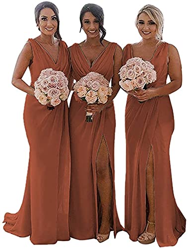 N/ C Brudtärneklänningar med dubbel V-hals, lång klänning i chiffong för brudtärna, bröllop, aftonklänningar för kvinnor, Bränd orange, 44 SE