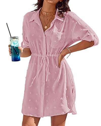 Rayson Dam strand täcker upp chiffong strandklänning v-hals 3/4 ärm sarong baddräkt klänning blus baddräkt lös kofta, Rosa, one size