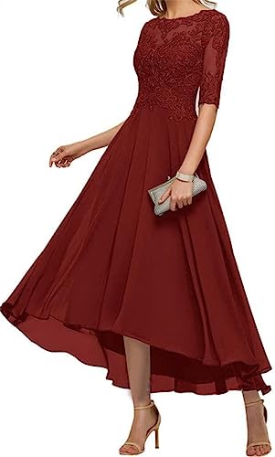 Spetsapplikationer brudens mor klänning 3/4 ärm te längd chiffong formella bröllopsfest balklänningar för kvinnor, Vinröd, 42 SE