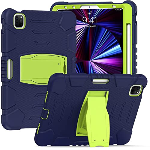 iPad Pro 12,9 2021 med stöd, hållbar, hybrid, chockerande, resistent, silikonskydd för tre lager bord för barn (blå + grön gul)