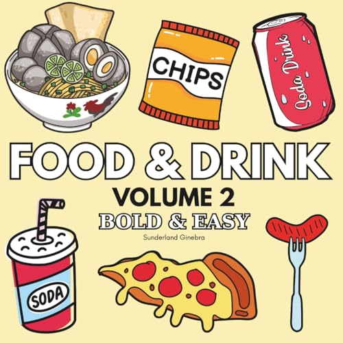 Food & Drink Volume 2: Coloring Book For Adults And Kids, Featuring Pizza, Dessert, Cupcake, Sausage, Donut, Candy, Chocolate, Chips, Drink and More (Bold & Easy Coloring)