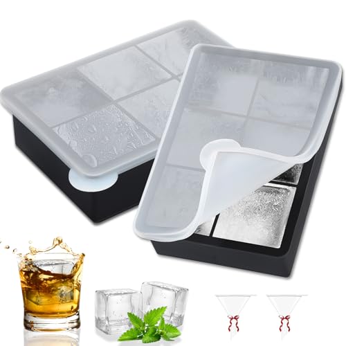 Gucass 2 stycken isbitsformar, silikon, isbitsbehållare med lock, 5 cm, 6 fack isbitsformar, stora kvadratiska isbitsskålar, BPA-fri isbitsbricka för whisky cocktails vin frukt choklad