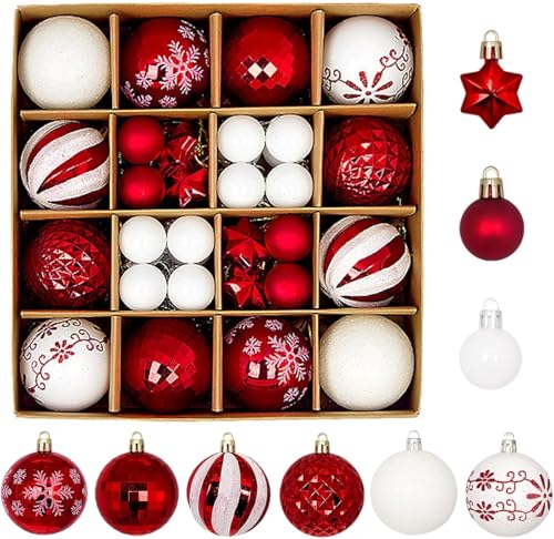 44 stycken julgranskulor i plast, julgranskulor i plast, juldekoration med hängare, glänsande, glittrande, julgransprydnad, dekoration (röd och vit)