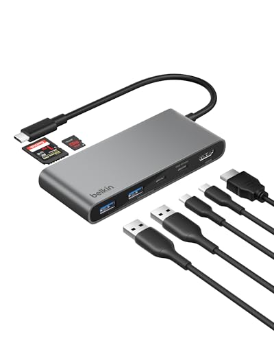 Belkin USB-C Hubb, Hubb med sju portar, MicroSD och 4K HDMI vid 60 Hz, SD- och MicroSD, 100 W PD, snabb dataöverföring 5 Gbit/s, USB-C adapter för MacBook, iPad Pro, Chromebook, m.fl. - HDMI 2.0 - Grå