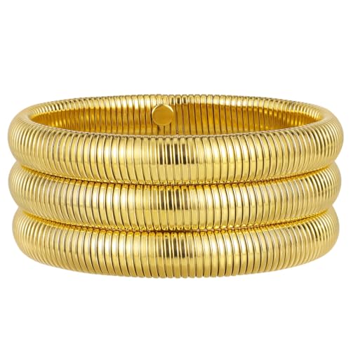Emibele Gold Bangle Bracelet Set 3Pcs, Chunky Titanium Non Tarnish 18K Gold Plated Bracelet Stack, Flexible Stretch Wide Wristband Bangle Layered Snake Chain Bracelet for Women