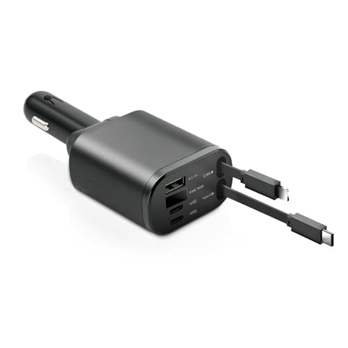 Billaddningskabel USB C, 5-i-1 laddningskabel bil 70 W, USB-C laddare bil cigarettändare med Lightnning&USB-C-port infällbar laddkabel, kompatibel med iPhone 16/15/14/13, Galaxy S25/S24/S23, iPad