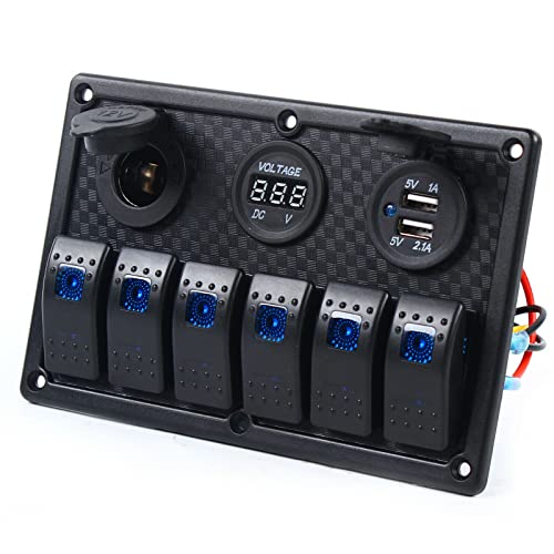 Tawvemi 5-gängs strömbrytare kontrollpanel LED-brytare 12 V/24 V bil båt fordon vippströmbrytare panel marin 2 USB och voltmeter cigarettändare (blå)