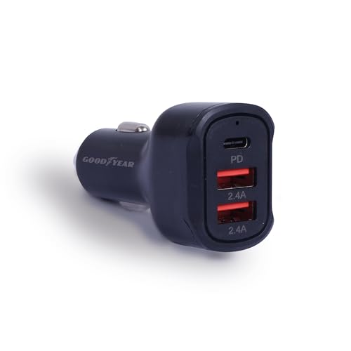 Goodyear 2 USB- och 1 USB-C-laddare, 3 portar för cigarettändare, bil, snabbladdning, multi-USB för iPhone 16/15/14/13/12/11 X, Samsung Galaxy S24/S23/S22/A54, Xiaomi, Huawei