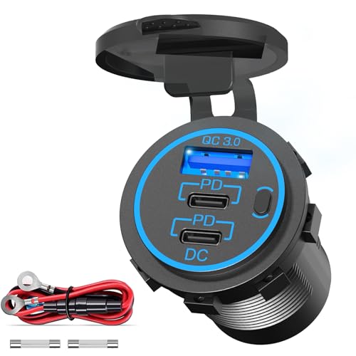 PD 3.0 USB C-uttag 12 V: Dubbel 30 W, typ C USB-uttag, vattentät 12-volts bil cigarettändare adapter med strömbrytare för iPhone husbil motorcykel båt lastbil