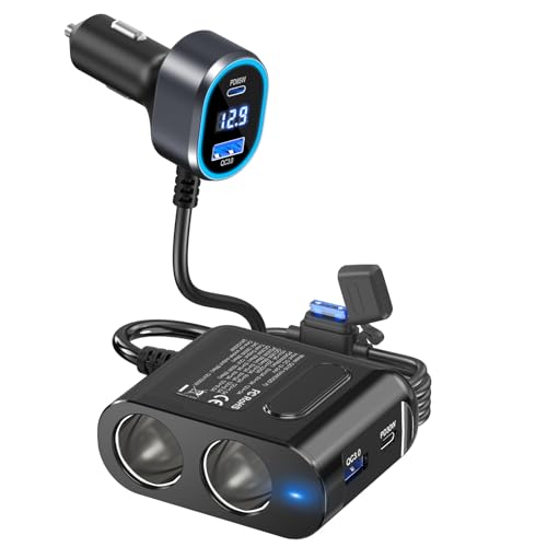 [Uppgraderad version] Snabbladdning 3.0 och PD20 W USB-C cigarettändare splitter, Qidoe 200 W 12 V/24 V bil eluttag med 3 fördjupade uttag 4 USB-laddningsportar och LED voltmeter strömbrytare