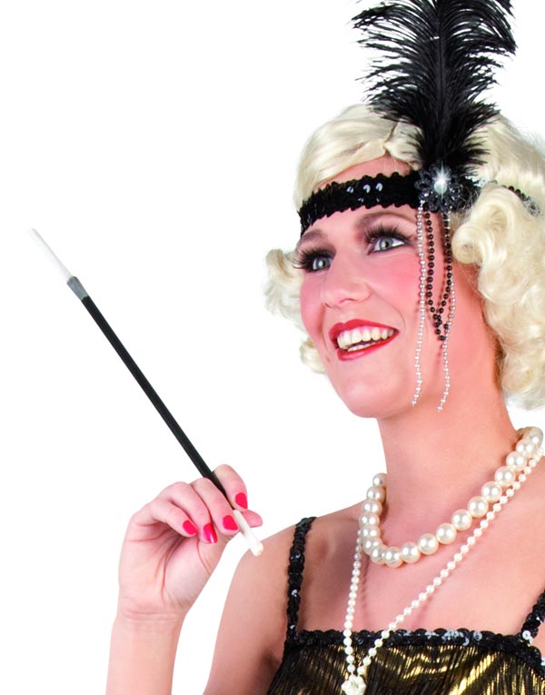 Black Flapper Peruk, cigaretthållare, pärlhalsband och fjäderhuvudbonad