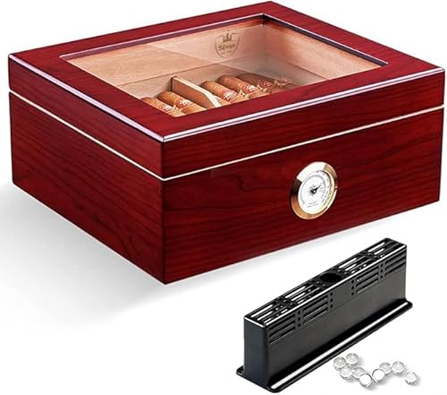 Eitida Cigarrhumidor fodral för 25–50 cigarrer, härdat glas, handgjord, spansk cederträ, förvaringslåda med skiljevägg, luftfuktare och hygrometer, Sapeli-körsbärsträ