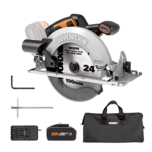 WORX NITRO - sladdlös cirkelsåg 20 V- 4Ah – 185 mm – WX520 – 5 200 varv/min (levereras med batteri och laddare, 65 mm ström, parallellstyrning, dammsugaradapter, skiftnyckel och metallblad)