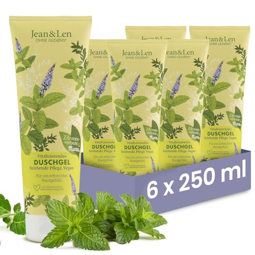 Jean & Len Vitaliserande duschgel med citronverbena och mynta, i praktiskt set, mild rengöring, frisk doft, utan mikroplast och mineralolja, vegansk duschgel, 6 x 250 ml